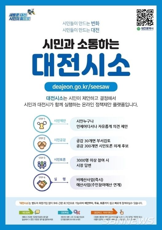 [sbn뉴스=대전] 남석우 기자 = 대전시는 누구나 직접 정책을 제안하고, 정책의 수립과 실행과정에 참여할 수 있는 온라인 플랫폼 ‘대전시소’를 22일부터 대전시 홈페이지에서 시범 운영한다.