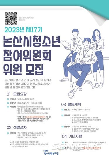 논산시는 오는 12월 9일까지 2023년 제17기 청소년참여위원회에 함께할 청소년을 모집할 계획으로, 관내에 거주하는 14세부터 24세 이하의 청소년을 대상으로 서류 및 면접 심사를 치른다.