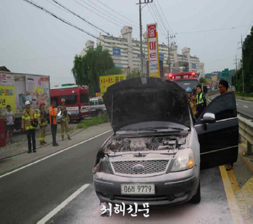 아산시 원인 미상의 승용차 화재발생... 엔진룸 소실