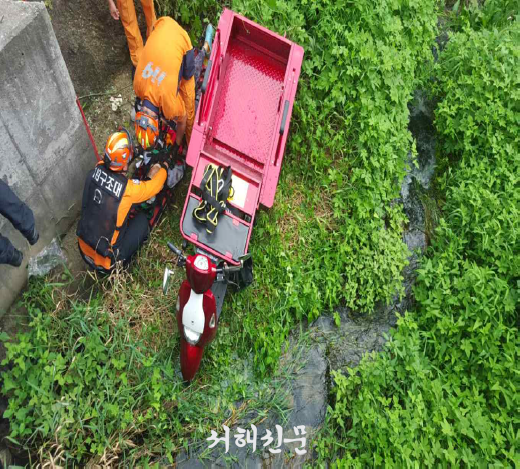 지난 9일 오후 4시 37분, 서산시 운산면 근처 도로에서 오토바이가 4미터 아래 하천으로 추락하는 사고가 발생했다.