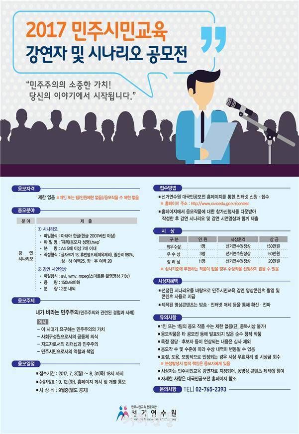 중앙선거관리위원회 선거연수원회가 주최하는 이번 공모전의 주제는 ‘내가 바라는 민주주의’로 일상생활에서 민주주의와 관련한 경험과 사례를 강연시나리오 형식으로 자유롭게 작성하면 된다.