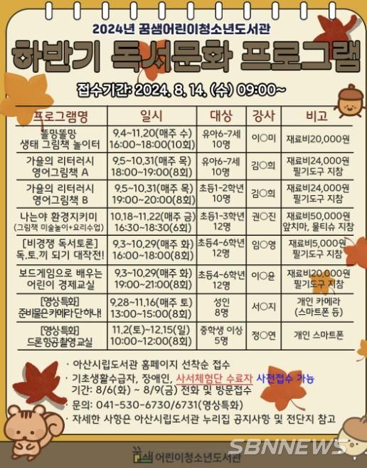 [sbn뉴스-서해신문·서해방송] 아산시 꿈샘어린이청소년도서관(이하 꿈샘도서관)이 2024년 하반기 독서문화 프로그램 수강생을 모집한다.