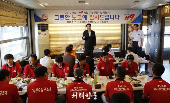 서천소방서(서장 이종하)는 17일 오전 11시, 시민수상구조대원 및 소방서 관계자 서천소방서 남·여 의용소방대연합회장 등이 참석한 가운데 ‘2017년 119시민수상구조대’ 해단식을 가졌다.이날 해단식은 여름 휴가철 춘장대해수욕장의 수난사고 예방활동을 성실히 수행한 119시민수상구조대원들의 노고에 대한 격려 및 운영상 애로사항을 청취하고 향후 개선을 위한 간담회 및 만찬의 형식으로 진행 되었다.