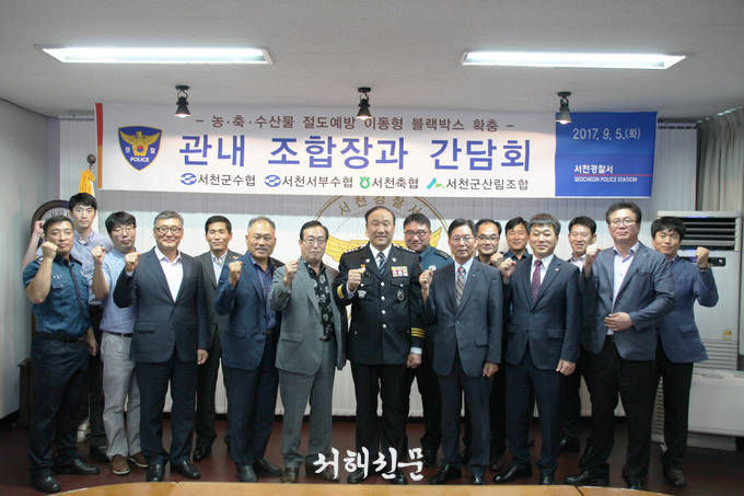 서천경찰서(서장 조기연)는 지난 5일 서천군수협, 서천서부수협, 서천축협, 서천군 산림조합 조합장 및 관계자 등 총 16명이 참석한 가운데 농·축·수·임산물 절도예방 이동형 블랙박스 확충을 위한 간담회를 개최했다.