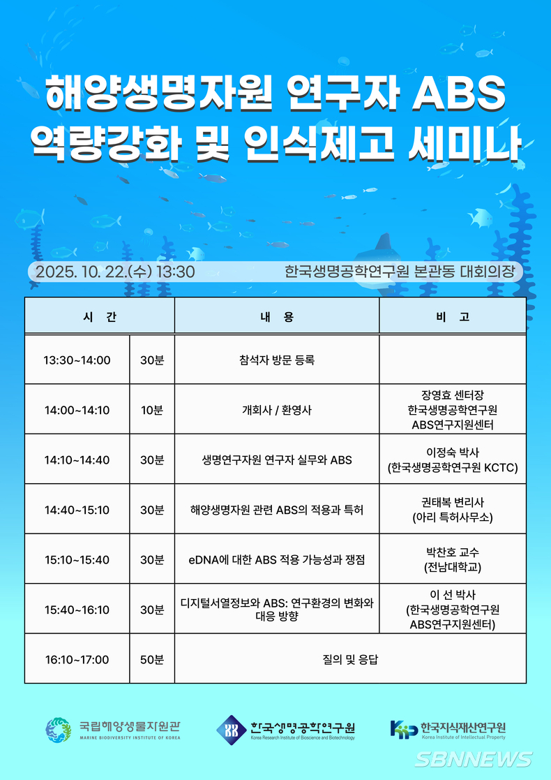 이번 세미나에서는 해외 해양생명자원을 이용한 연구 중 발생할 수 있는 ABS 이슈를 연구 현장의 사례를 중심으로 진행되며, 환경 DNA와 디지털 서열정보에 대한 최근의 연구 결과도 함께 소개한다.