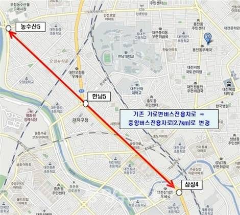 대전광역시(시장 권선택)는 대전과 세종을 연결하는 BRT(간선급행버스체계) 도로 및 버스정류장 공사 완료에 따라 삼성4~농수산5 2.7㎞구간에 중앙버스전용차로 시행계획을 4일 고시했다고 밝혔다.