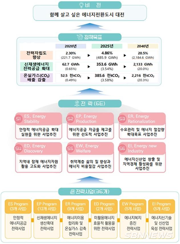 대전시는 전력자립도 향상, 신재생에너지 확대, 온실가스 감축 부문에서 단기적으로 2025년, 장기적으로 2040년까지의 목표를 제시했다.