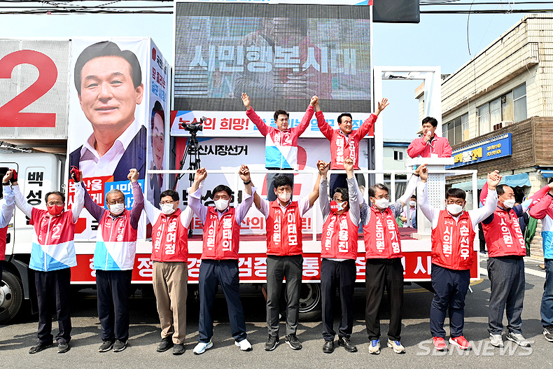 김태흠 후보는 국민의힘 후보자들과 함께 논산화지시장과 보령시장 등에서 유세를 펼치며 지지를 호소했습니다.
