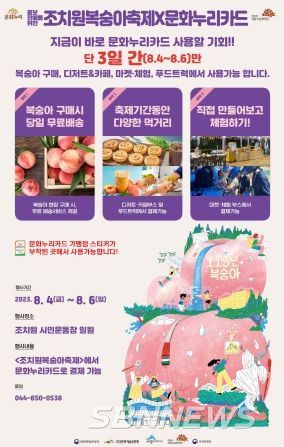 카드 소지자들은 행사장 내 ‘문화누리카드 가맹점 스티커’가 부착돼 있는 30여 개의 가맹점에서 복숭아 구매 및 식음료, 체험 등에 카드를 이용할 수 있다.