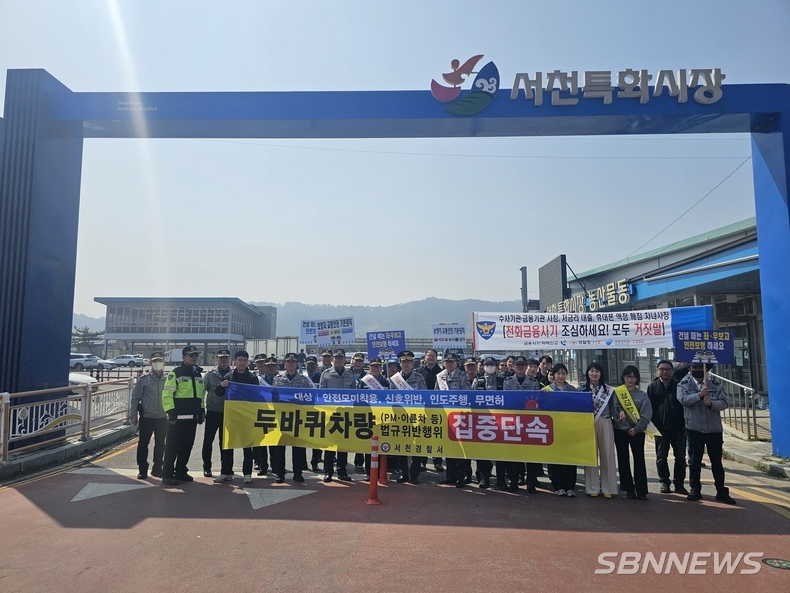 서천경찰서(서장 김영돈)는 최근 급증하는 교통사고 사망자를 줄이기 위해 9일 서천읍 서천특화시장 앞 로터리에서 유관기관 합동 두 바퀴 차 교통법규 위반 일제 단속과 운전자 및 보행자들에게 교통안전 문화 정착을 위한 캠페인을 벌였다.