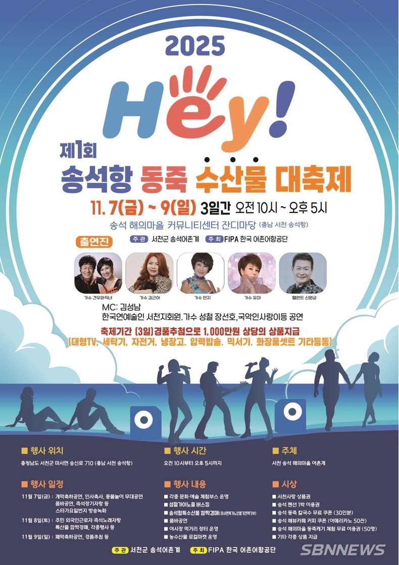 서천군은 마서면 송석어촌계가 11월 7일부터 9일까지 사흘간 송석항 일원에서 ‘제1회 헤이(HEY) 송석항 동죽 수산물 대축제’를 개최한다고 밝혔다.