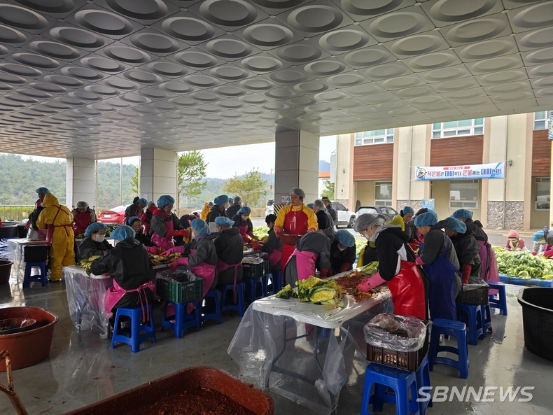 직원들은 경작지에서 수확한 배추를 함께 절이고 양념에 버무린 뒤 포장하는 전 과정에 구슬땀을 흘렸다.