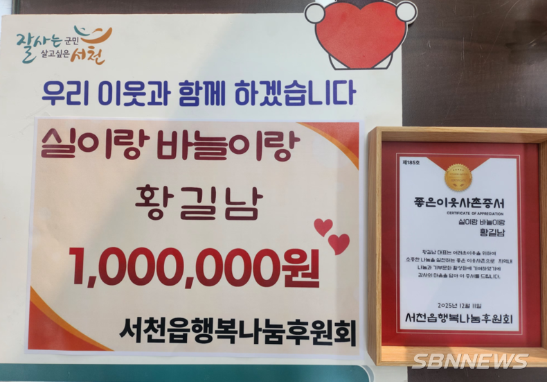 서천읍행복나눔후원회는 이날 황 대표를 ‘좋은이웃사촌’ 제185호로 선정하고 증서를 전달했으며 후원금은 연말연시 취약계층 지원 사업에 사용할 계획이다.