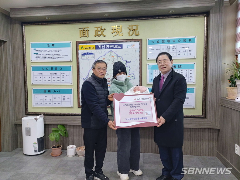 기산면 솔바람공동체후원회는 지난 23일, 기산면 출산 가정을 방문해 출산축하금 50만 원을 전달하며 새 생명의 탄생을 축하했다.