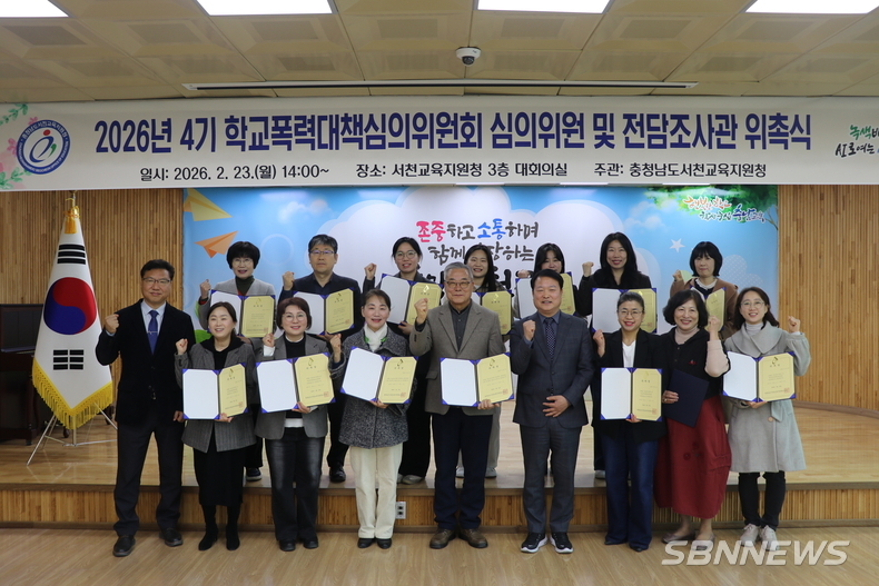 서천교육지원청(교육장 오황균)은 지난 23일 2026학년도 학교폭력통합지원센터 위촉식을 개최하고, 학교폭력대책심의위원 21명과 학교폭력전담조사관 2명에게 위촉장을 수여했다.