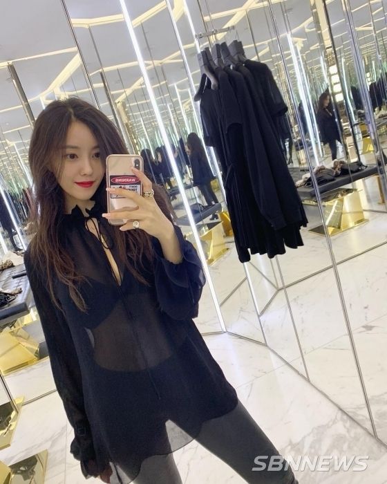 공개된 사진 속 효민은 블랙 의상과 강렬한 레드립으로 세련미를 뽐내며 거울 속 자신의 모습을 찍고 있는 모습이다.