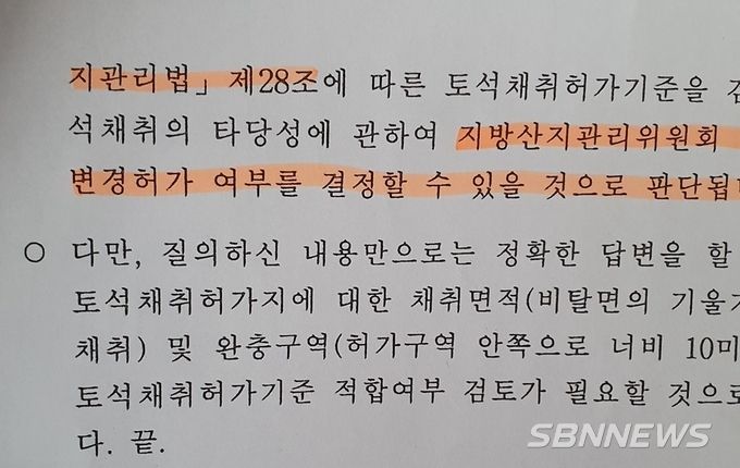 산림청은 또 신규 토석 채취 허가를 할 때 연접된 기존 토석 채취 허가에 대한 변경허가를 신청, 채취 면적 및 완충지역 등에 대한 토석 채취 허가기준을 검토하여야 할 것이나 신규 토석 채취 허가와 별개로 기존 토석 채취 허가지에 대한 변경허가를 신청했다면 신규 토석 채취 허가지와 관계없이 ‘산지관리법 시행령 제32조 2항에 따른 토석 채취 허가절차에 따라 ’산지관리법 제28조]에 따른 토석 채취 허가기준을 검토 후 토석 채취의 타당성에 관해 지방산지관리위원회 심의를 거쳐 변경여부를 결정할 수 있다고 답해왔다.