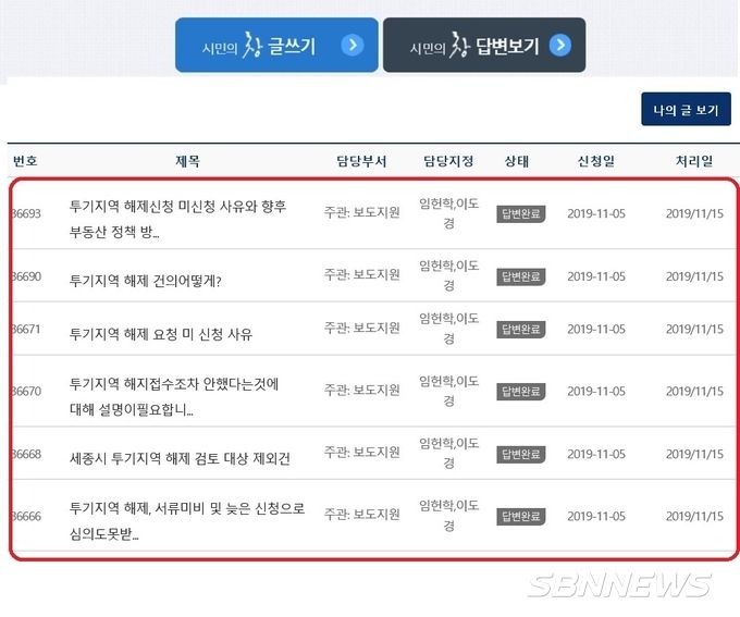 지난 5일 이후 세종시청 홈페이지 '시문시답'에 50여명의 네티즌들은'세종시는 왜 정부에 투기과열지구해제를 건의하지 않았느냐'는 세종시민의 비난성 질의가 적지 않았다.
