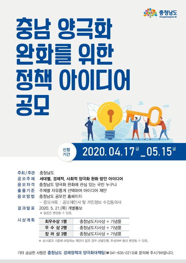 [sbn뉴스=내포] 손아영 기자 = 충남도는 도내 양극화 문제 해결을 위해 도민뿐만 아니라 충남 양극화에 관심 있는 전 국민을 대상으로 정책 아이디어를 15일까지 공모한다.