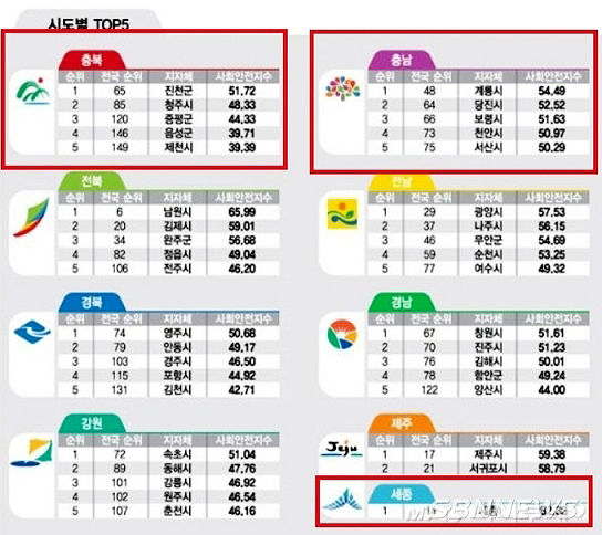 인구 36만명인 세종은 전체 11위 (사회안전지수 62.32)로 충청권에서 60%대를 유일하게 넘겨 좋은 평가를 받았다.