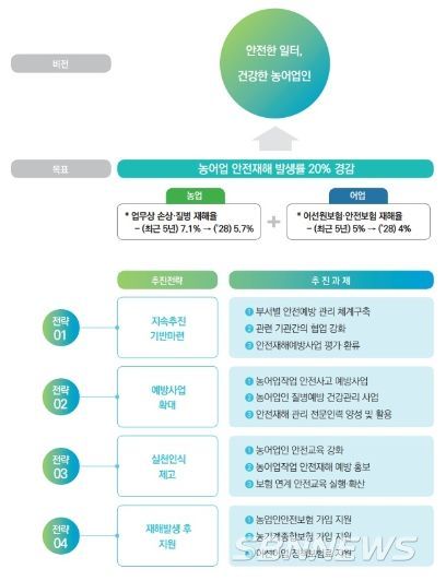 전략별 주요 과제로는 부서별 안전 예방 관리 체계 구축 및 협업 강화, 농업인 질병 및 안전사고 예방 사업 확대, 전문인력 양성 및 활용, 안전교육 및 홍보 강화, 농어업 정책보험료 지원 등을 추진할 방침이다.