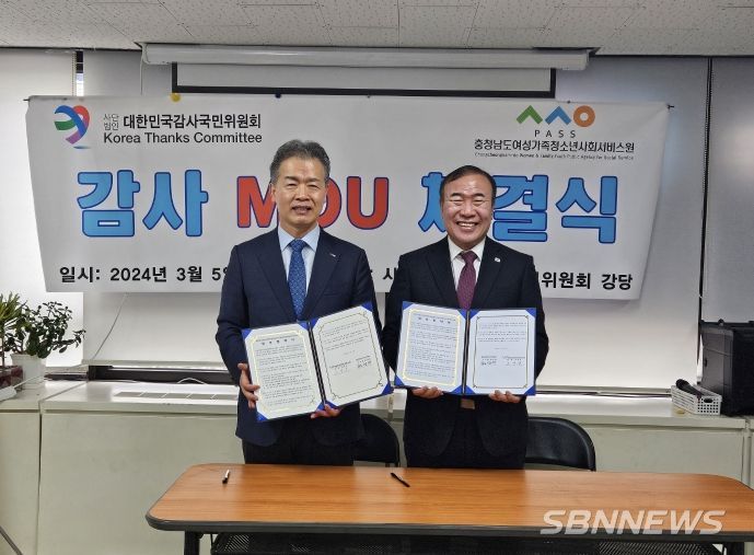 [sbn뉴스-서해신문·서해방송] 충청남도여성가족청소년사회서비스원(원장 조경훈)과 사단법인 대한민국국민감사위원회(이사장 한상대)는 2024년 3월 5일 대한민국국민감사위원회에서 충남도내 청소년의 올바른 인성함양을 위해 상호 협력하기 위한 업무협약을 체결했다.
