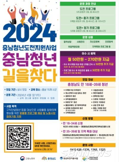 [sbn뉴스-서해신문·서해방송] 충남도는 진로탐색 및 취업역량강화 등 맞춤형 과정을 제공해 구직 자신감 회복과 경제활동 참여를 지원하는 ‘청년도전 지원사업’ 참여자를 상시 모집한다고 28일 밝혔다.