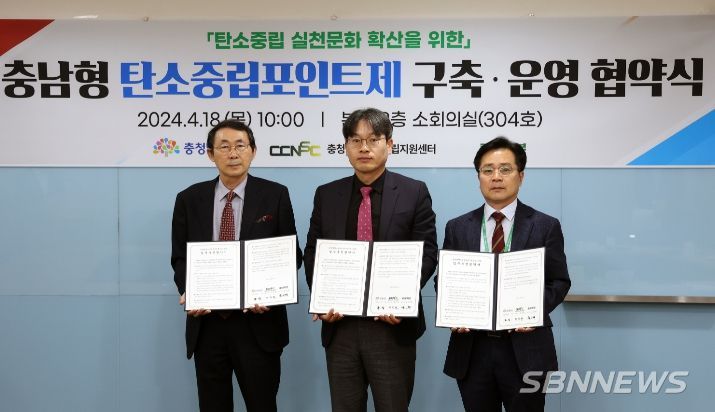 도는 18일 도청 소회의실에서 충남탄소중립지원센터(센터장 이진헌), 마이카본(대표이사 윤인택)과 ‘충남형 탄소중립포인트제 구축·운영 업무추진협약’을 체결했다.