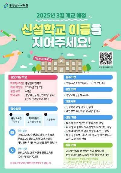더불어 4월 19일부터 5월 1일까지 신설학교 교명 공모를 진행한다. 누구나 참여가 가능하며 공모 방법은 도교육청 누리집에 신청서를 작성하여 응모할 수 있다. 이후 5월 중 교명선정위원회의 심의와 자문을 거쳐 향후 충청남도 도립학교 설치 조례개정을 통해 교명이 최종 확정된다.