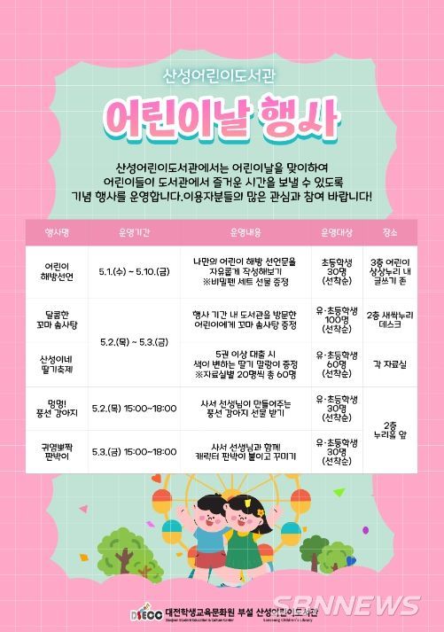 [sbn뉴스-서해신문·서해방송] 대전학생교육문화원 부설 산성어린이도서관은 도서관 이용 활성화 및 어린이 문화 향유 기회 확대를 위해 어린이날 기념 행사를 5월 2일과 3일 양일간 운영한다고 밝혔다.