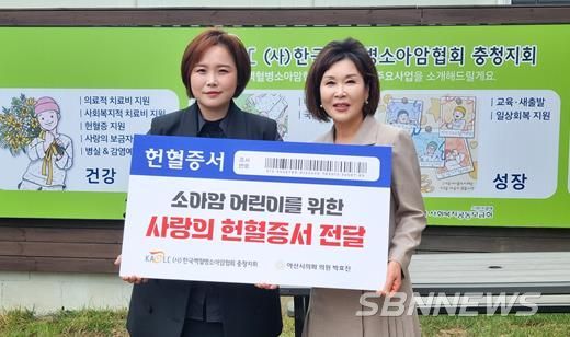 [sbn뉴스-서해신문·서해방송] 아산시의회 박효진 의원이 지난달 29일 (사)한국백혈병소아암협회 충청지부에 사랑의 헌혈증 100장을 전달했다.