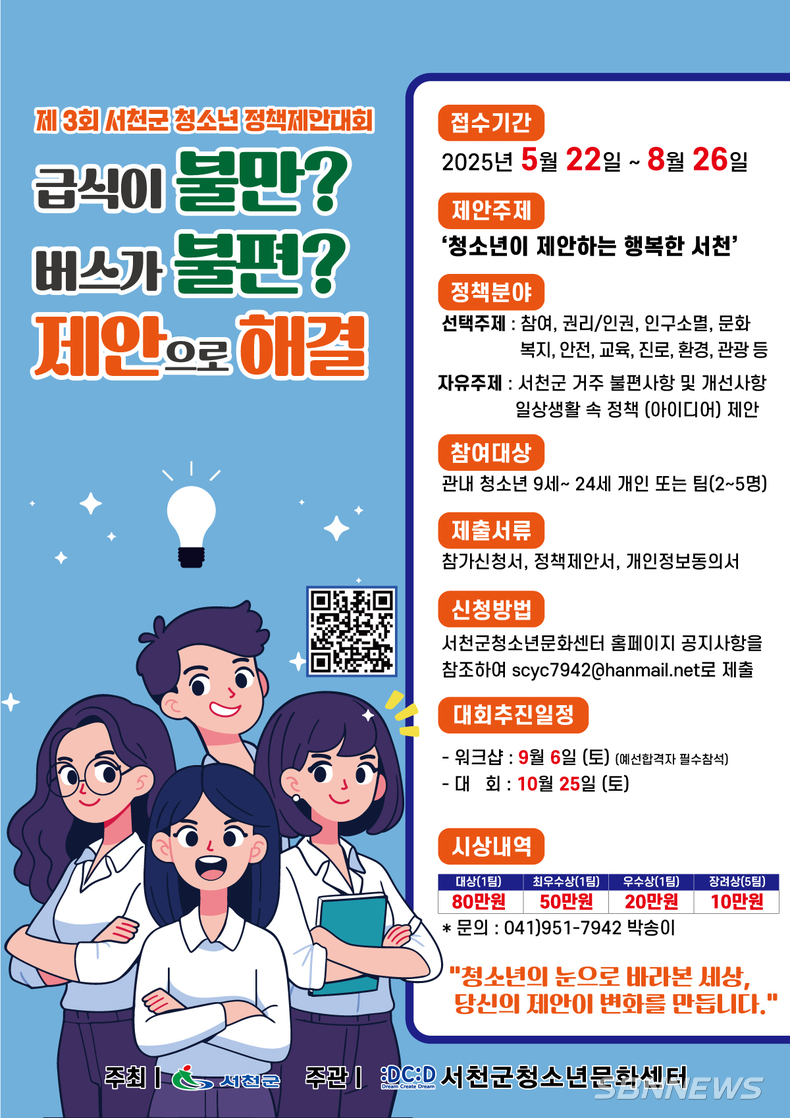서천군 청소년문화센터(관장 김묘왕)는 청소년들이 건강하고 행복한 삶을 꿈꾸는 지역사회에 대해 생각하고 청소년의 시각에서 서천군의 발전을 위한 정책을 제안하는 ‘제3회 서천군 청소년 정책 제안 대회’를 오는 10월 25일(토)에 개최한다.