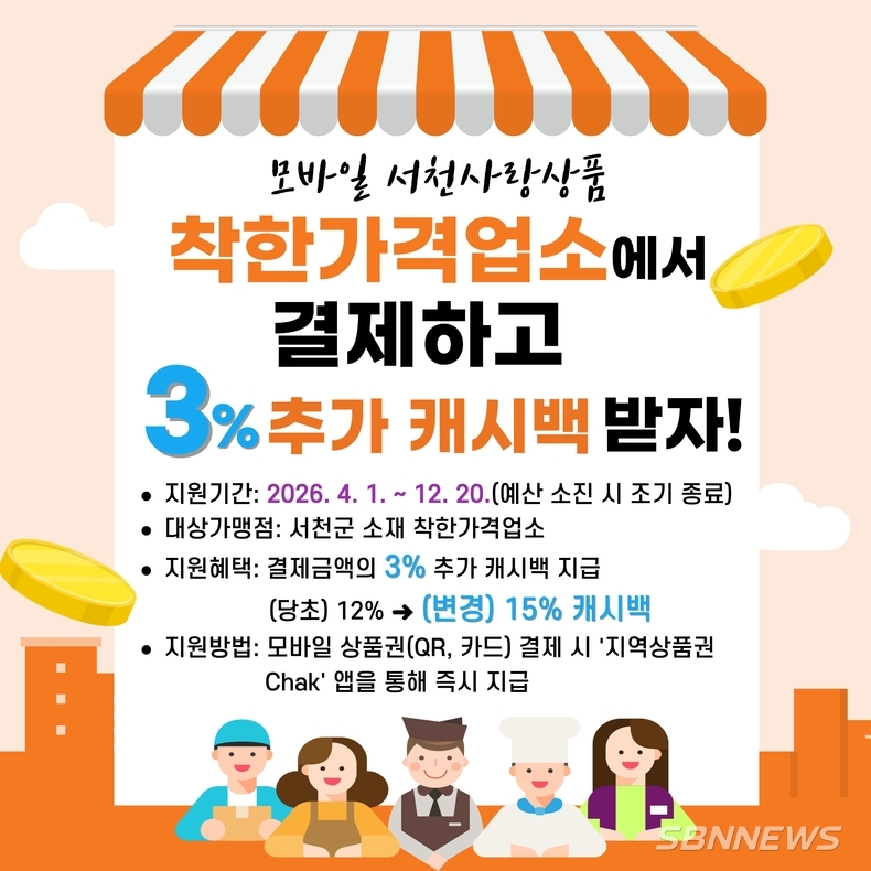 이번 사업에 따라 착한가격업소에서 모바일(카드) 서천사랑상품권으로 결제할 경우, ‘지역사랑상품권 Chak’ 앱을 통해 결제금액의 3%를 추가 캐시백으로 지원받을 수 있다.