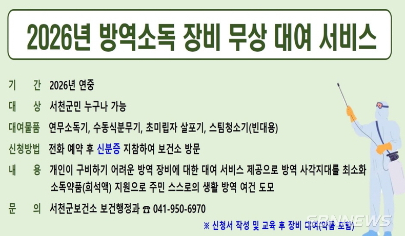 서천군보건소는 감염병 예방과 쾌적한 생활환경 조성을 위해 방역소독 장비 무상 대여 서비스를 운영한다고 밝혔다.