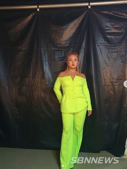 사진 속 박나래는 상하의 모두 네온 컬러인 슈트를 입고 포즈를 취하고 있어 눈길을 끈다.