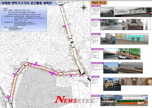 사업 구간은 이태원역에서 청화아파트삼거리를 지나 녹사평대로까지 총 연장 890m다. 구는 보도를 확장·정비할 뿐만 아니라 가로등과 야간경관을 정비하고 앤틱 상징 조형물 및 휴게 공간을 설치해 가구거리를 서울의 몽마르뜨로 변신시키고자 한다.