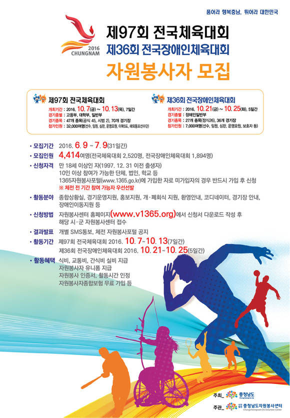 충남도는 제97회 전국체육대회와 제36회 전국장애인체육대회에서 활동할 자원봉사자 4414명을 다음달 9일까지 모집한다고 9일 밝혔다.