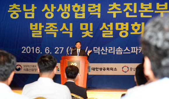 도는 27일 예산군 리솜스파캐슬에서 충남 지역상생협력추진본부 발족식을 갖고 도와 농식품부, 대한상의, 충남창조경제혁신센터 간 업무협약(MOU)을 체결했다고 밝혔다.