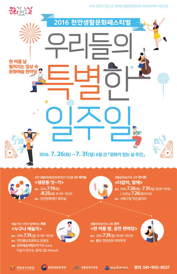 (재)천안문화재단(대표이사 박상규)은 문화체육관광부와 (재)생활문화진흥원이 주관한 ‘2016 문화가 있는 날’ 권역별 생활문화동호회 교류 프로젝트의 일환으로 2016 천안생활문화페스티벌 ‘우리들의 특별한 일주일’을 개최한다.