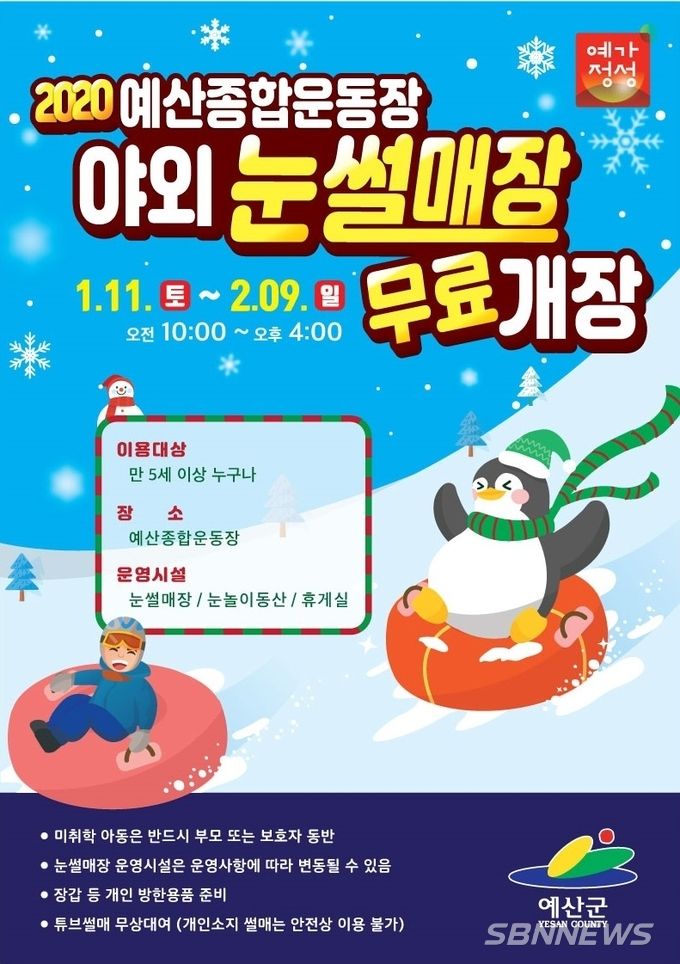 [sbn뉴스=예산] 신혜지 기자 = 충남 예산군은 오는 1월 11일부터 2월 9일까지 예산종합운동장에서 어린이와 성인을 위한 야외 눈썰매장을 개장한다.
