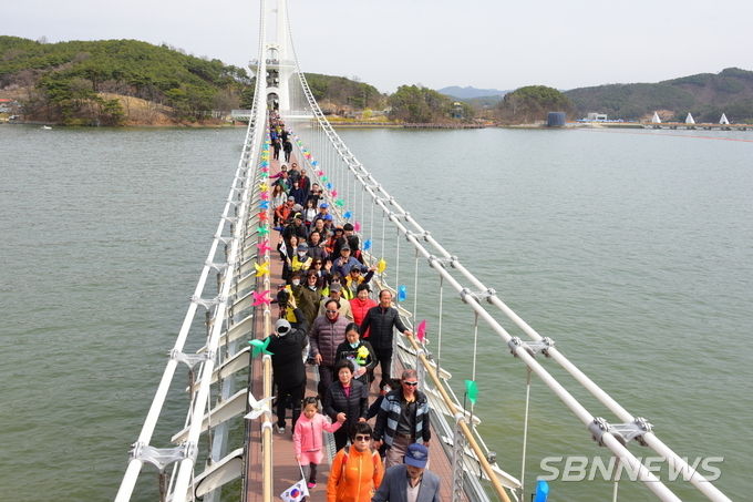 [sbn뉴스=예산] 신혜지 기자 = 충남 예산군의 랜드마크로 자리매김한 국내 최장 402m의 예당호 출렁다리 방문객이 지난 4월 6일 개통 이후 281일만인 1월 11일 300만명을 돌파했다.