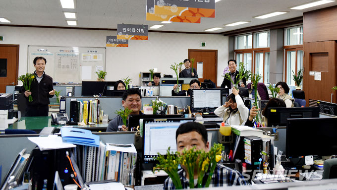 사무실 책상 하나에 한 개의 꽃을 키우는 캠페인으로, 관내 출하가 가장 시급한 프리지아를 농업기술센터부터 각 실과까지, 꽃 소비 촉진 운동을 진행하는 것입니다.