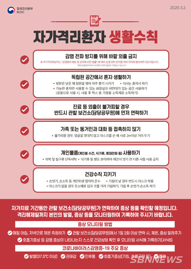 자가격리자는 코로나19 확산 방지를 위해 △격리장소 외에 외출 금지 △독립된 공간에서 혼자 생활하기 △진료 등 외출이 불가피할 경우 반드시 관할 보건소에 먼저 연락하기 △가족 또는 동거인과 대화 등 접촉하지 않기 △개인용 수건, 식기류, 휴대전화 등 개인물품 사용하기 △건강수칙 지키기 등의 수칙을 준수해야 한다.