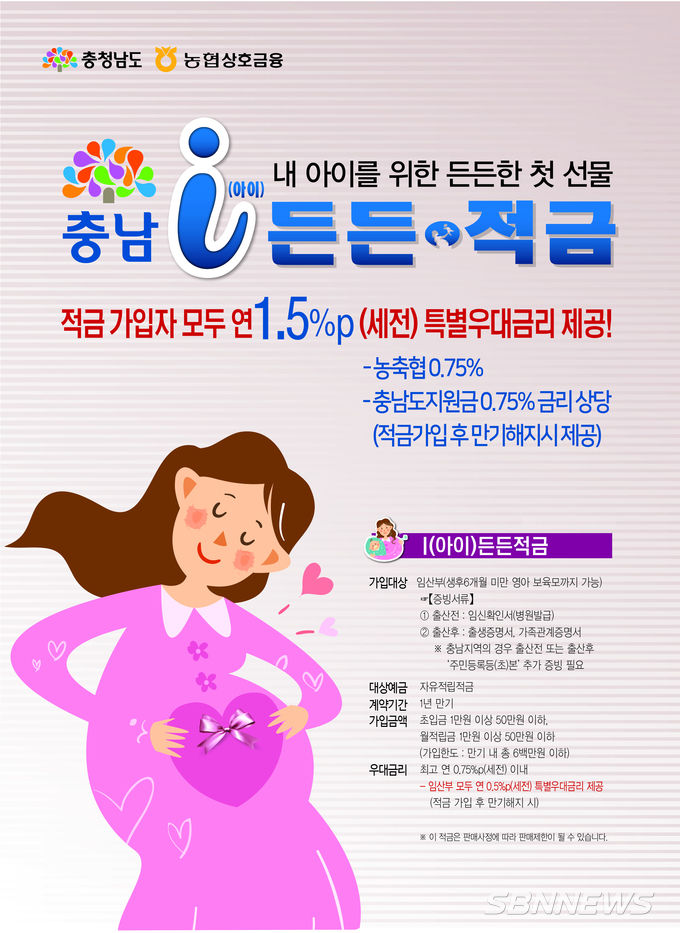 자유 적립 적금으로, 충남도에 주민등록을 둔 임신부와 출산 후 6개월 미만 출산부가 대상이다. 더불어 다자녀 가정을 위해 태아 수에 비례해 계좌를 추가로 가입할 수도 있다.