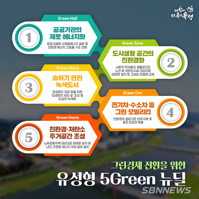 유성구는 ‘유성형 5Green 뉴딜 계획’으로 ▲공공기관의 제로에너지화(Green Hall) ▲도시공간의 녹색전환(Green Zone) ▲저탄소ㆍ분산형 에너지 확산(Green Wood) ▲전기차ㆍ수소차 그린 모빌리티 확대(Green Car) ▲친환경ㆍ저탄소 주거공간 조성(Green Home)의 5개 분야를 제시했다.