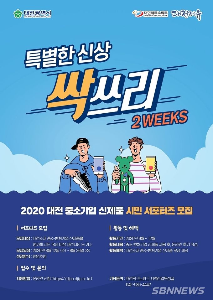 [sbn뉴스=대전] 권주영 기자 = 대전시와 대전테크노파크는 지역 중소기업의 신제품을 테스트할 시민 서포터즈 1800여 명을 모집한다고 10일 밝혔다.