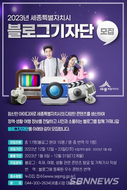 [sbn뉴스-서해신문·서해방송] 세종특별자치시가 참신한 아이디어로 현장에서 발생하는 생생한 소식을 전달할 ‘제11기 블로그 기자단’을 12일부터 23일까지 2주간모집한다.