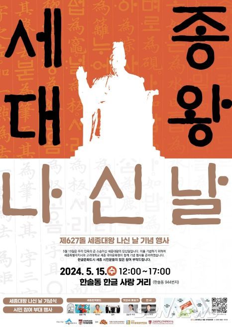 세종특별자시는 오는 15일 한솔동 한글사랑거리 일원(한솔동 944번지)에서 ‘세종대왕 나신 날’ 기념행사를 개최한다.