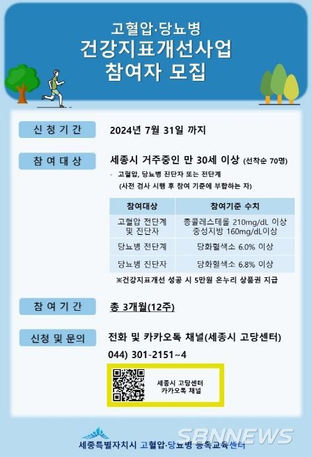 참여는 오는 7월 31일까지 가능하며 선착순 70명을 모집한다. 신청은 전화, 세종시 고혈압·당뇨병 등록교육센터 카카오톡 채널을 통해 가능하다.