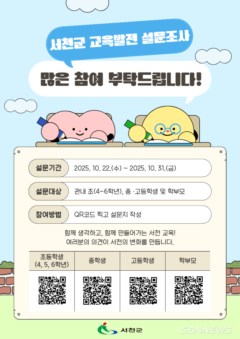 한편, 설문은 10월 22일부터 10월 31일까지 진행되며 ▲서천군청 누리집 공지사항, ▲온라인 네이버폼, ▲지역밴드, ▲학교기관을 통한 배부 등으로 다양하게 운영된다.